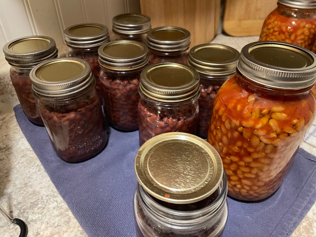 Home canned beans have become a staple for us! I am thankful I could can two batches this month- one of black beans (pints) and one of baked beans (quarts). As you can see, one jar didn’t even leave its ring on the lid. So, it got used right away.