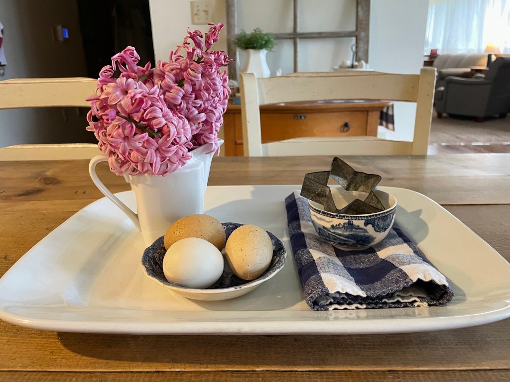 Freshly cut hyacinths (smelled amazing) and some older blown eggs make a sweet table centerpiece for Easter/spring.