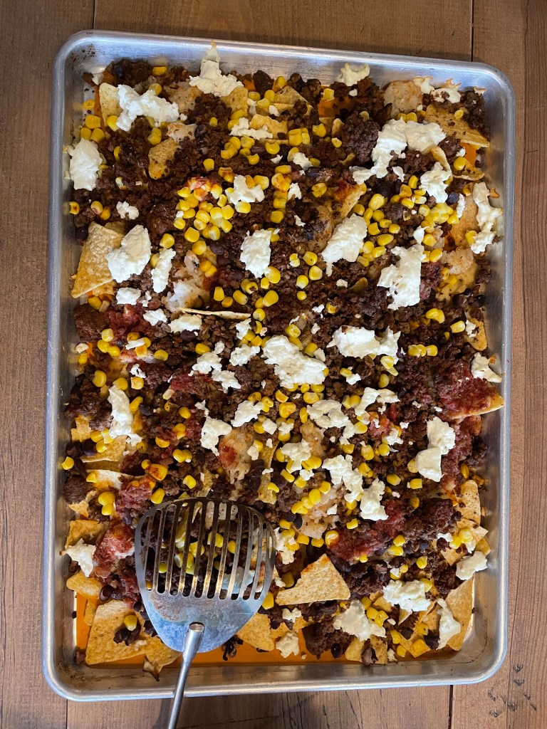 We had baked nachos for lunch using leftover Mexican rice we needed to eat and I added some extra ground beef/liver that had been browned and spiced it up. I drained and rinsed some black beans. Added frozen corn. And topped it with homemade cheese and salsa. We ate this over lettuce.