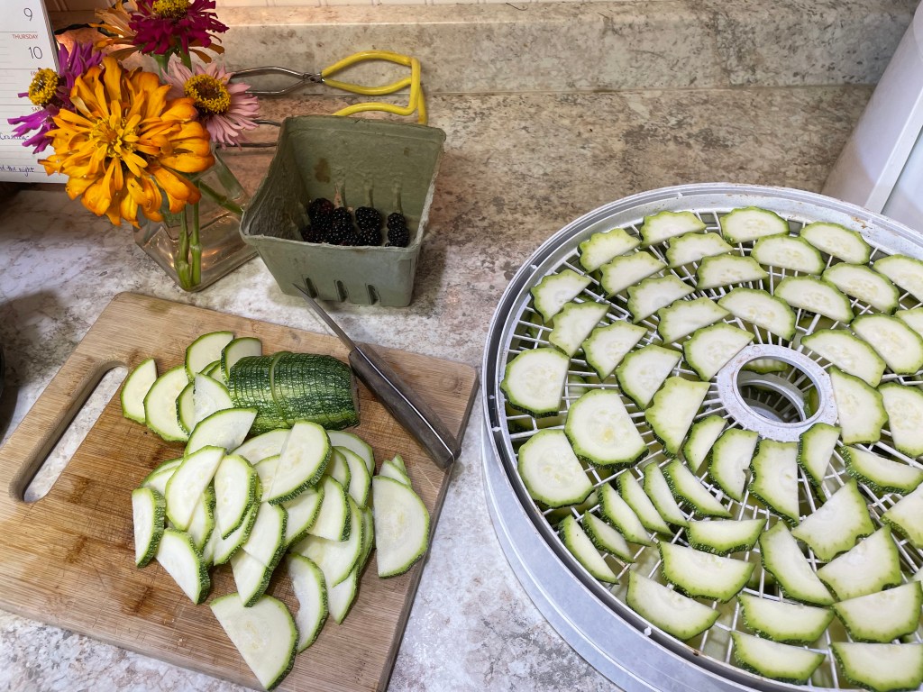 As we start getting zucchini in, we like to eat the smalls, dehydrate the mediums, and shred the larges. Huge ones go to the hens… actually one year, Sweet Husband grew an entire zucchini crop just for the hens. We have also been drying all of our kale and making super greens powder.
