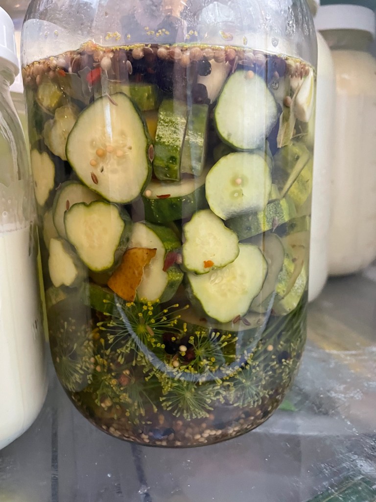 Don’t mind the dirty fridge shelf. With our cucumbers we are making refrigerator dill pickles- delish! They last about a month in the fridge and I continue to reuse the brine for a couple of batches. They are out on the table 2-3 meals per day. Three of us like them but everyone tries at least one each time they are served. In this manner, my kids have learned to like and enjoy many different foods. Notice the lovely, homegrown dill flowers at the bottom of the jar?