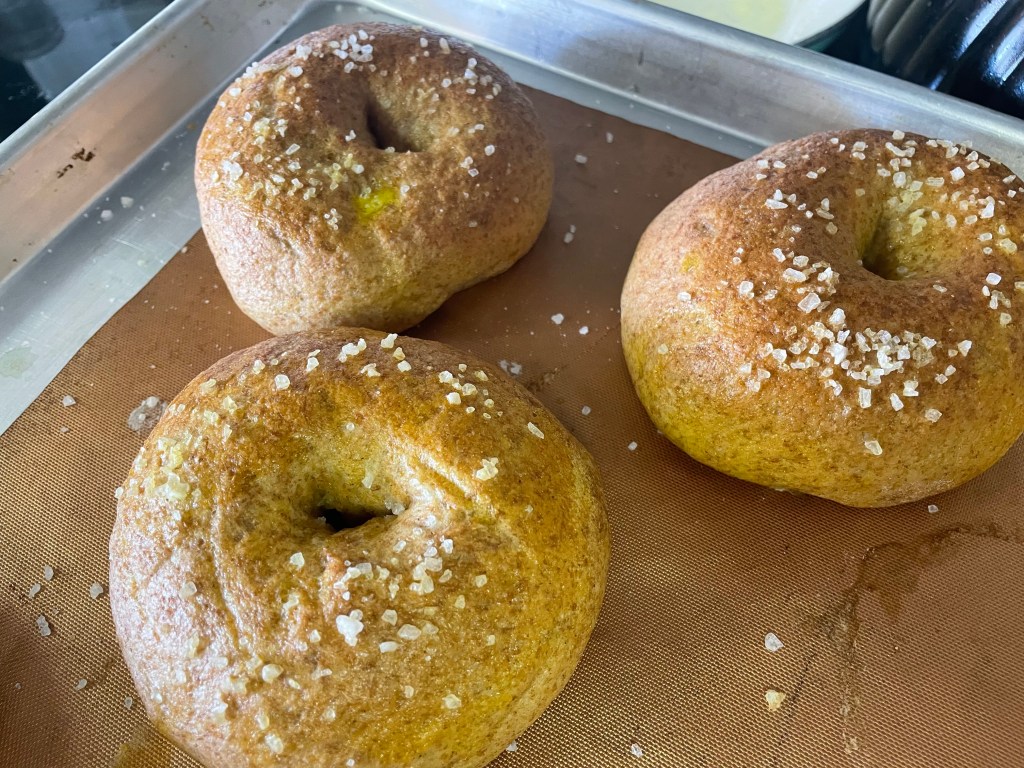 I continue to try bagels… this recipe is from the booklet that came with my flour mill. They turned out good! I might even halve them next time and make smaller bagels. Though, I will try another topping in future.