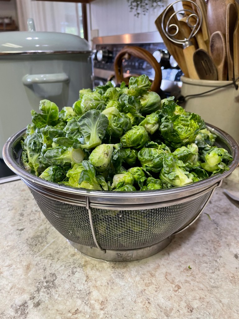 This was the first year that our brussel sprouts actually made sprouts. We have only ever gotten leaves. How exciting! My sons harvested the plants (approx. 6 plants) and brought them inside to cut the sprouts off of the stalks. Unfortunately this year, we didn’t get even one cauliflower. Bummer…