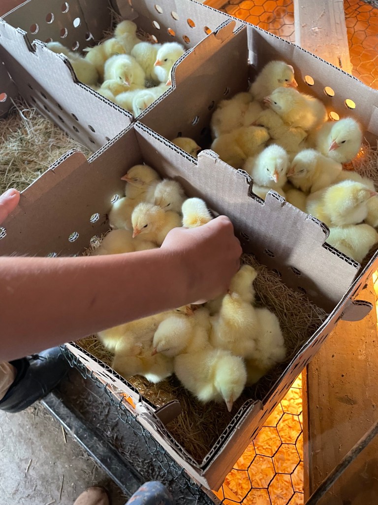 Our 125 baby Cornish Cross chicks arrived last week. We have already lost some, unfortunately, but that does happen. We have had a bit cooler temps at night as well as in the day, so that made a difference. But, it’s warming up now. They seem to be thriving and definitely growing fast.