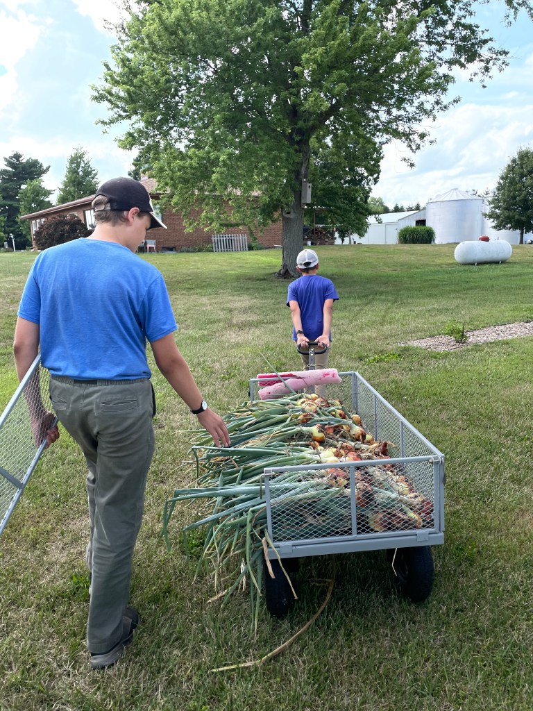My boys and I enjoyed harvesting the onions! And, wow, let me say… this is the best harvest we have ever had. 101 onions! They are still curing in the basement and I will use them in my favorite fermented salsa.