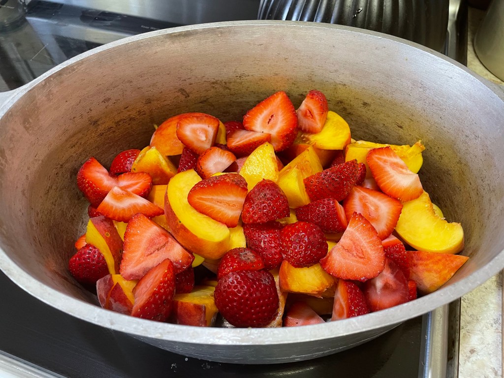 Strawberry peach jam- not our own strawberries (yet!), but a good price on organic I found and got to preserve and eat fresh.