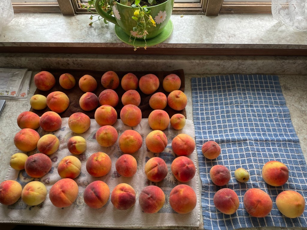 Our larger peach tree produced about 60 peaches this year! Whoop! Our little tree, planted this spring, was actually planted to help pollinate the larger tree and even the smaller tree produced 13 tiny, but edible, peaches. I have made a crisp, we’ve eaten a ton fresh, and I made both vanilla peach butter and strawberry peach jam.