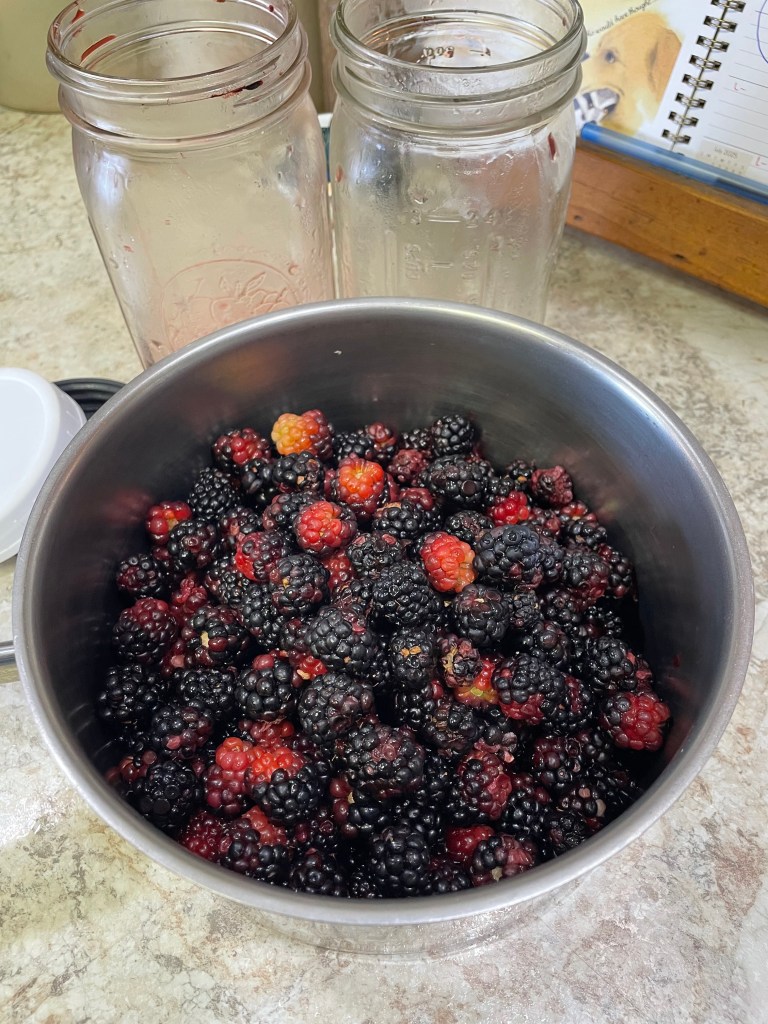 Our blackberry patch is producing a lovely amount this year. I have already canned one batch of jelly (my teeth don’t like seeds, so I strain them out). We collect the berries, wash, and store them in a quart sized jar until we have enough for canning or baking.