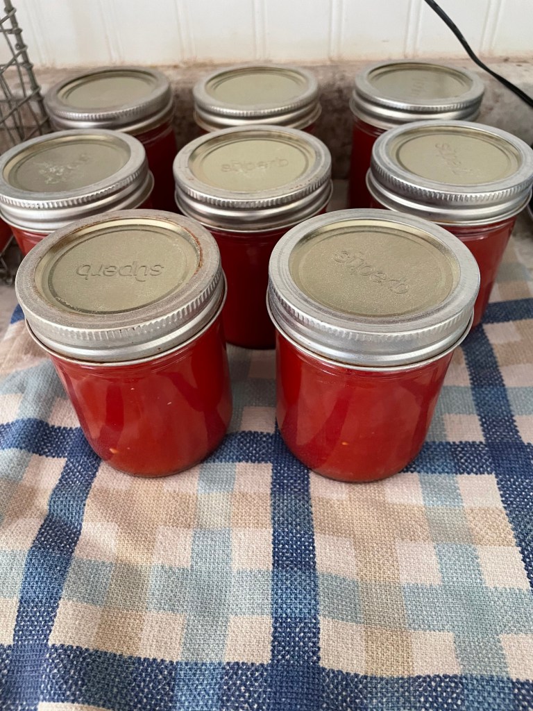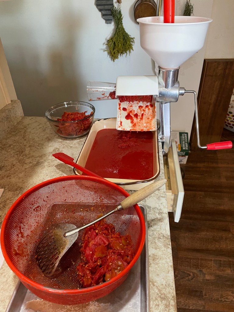 Here, we are processing our last picking of tomatoes. We ended up with about 6 cups of sauce.
