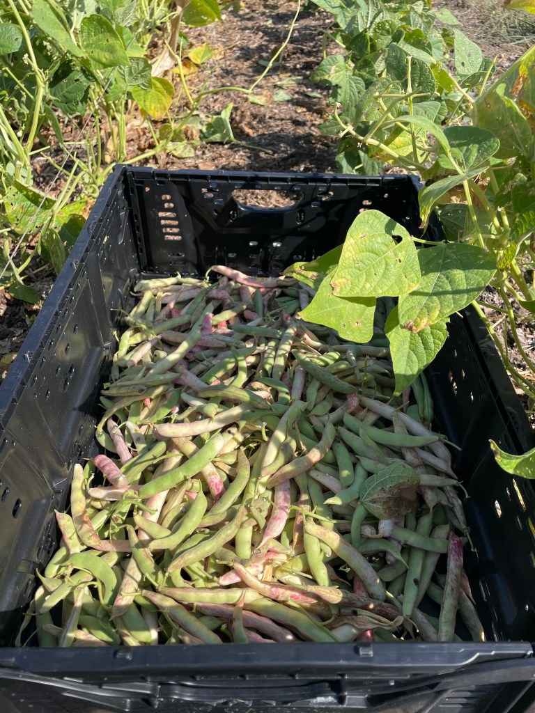 I enjoyed listening to a podcast and picking these lovely October beans (aka Dwarf Horticultural) one sunny afternoon before taking field snacks to our farmers. We planted 3 rows of these. This was a bean we grew and ate when I was a child- nostalgia!