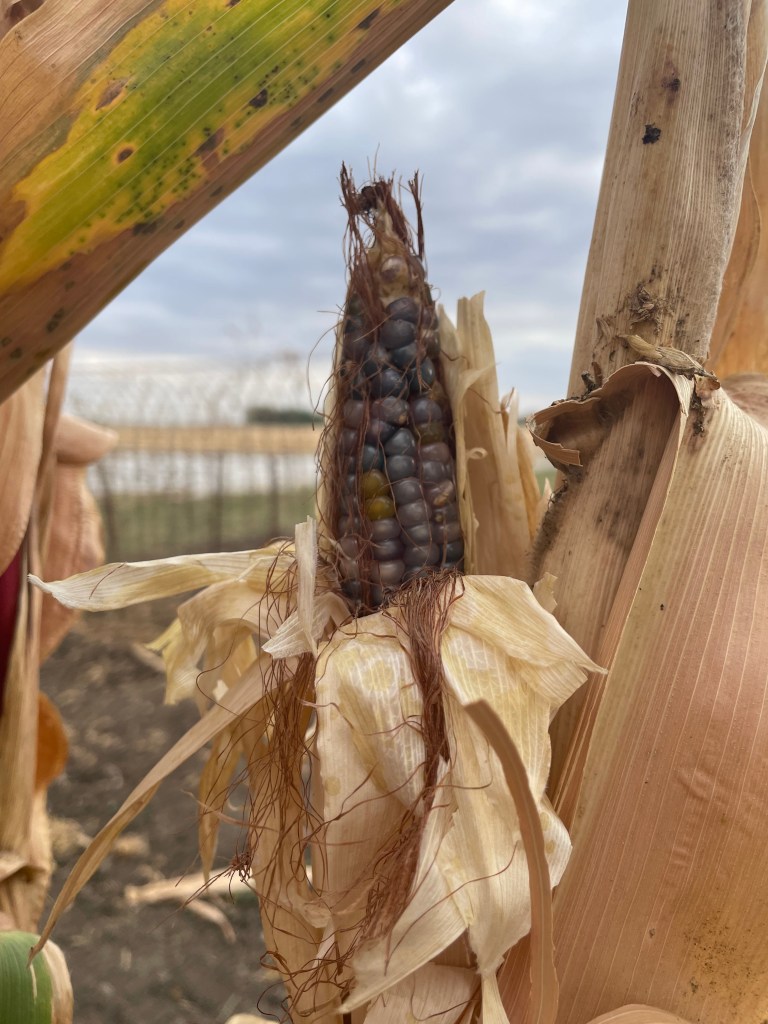 (first photo above): The only crop left standing yet to be harvested is our Glass Gem popcorn. I asked Sweet Husband (our resident corn growing expert) to see what he thought about the moisture level without having to mechanically check it. He said (after feeling and tasting it) it wasn’t ready yet. We are letting it dry on the stalk a bit longer. Popcorn, I’ve learned, should be between 13-14.5 percent moisture inside the kernel. When we grew it two years ago, we must have let it dry too long because it won’t pop! No loss though- we grind it for cornmeal!