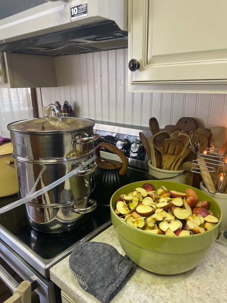 The final project I’ll share: apples! These here are homegrown apples(we don’t know the variety). But we also purchased 2 bushels of Jonagold from a local Amish market and saved some for fresh eating. The rest we made into juice and sauce. I tried both regular and cranberry apple sauce. The latter is going to be my new favorite! You can see in the photo my new steam juicing tool- wow! Two products for the time it takes to make one!(see our Facebook page for the finished product photo!!)