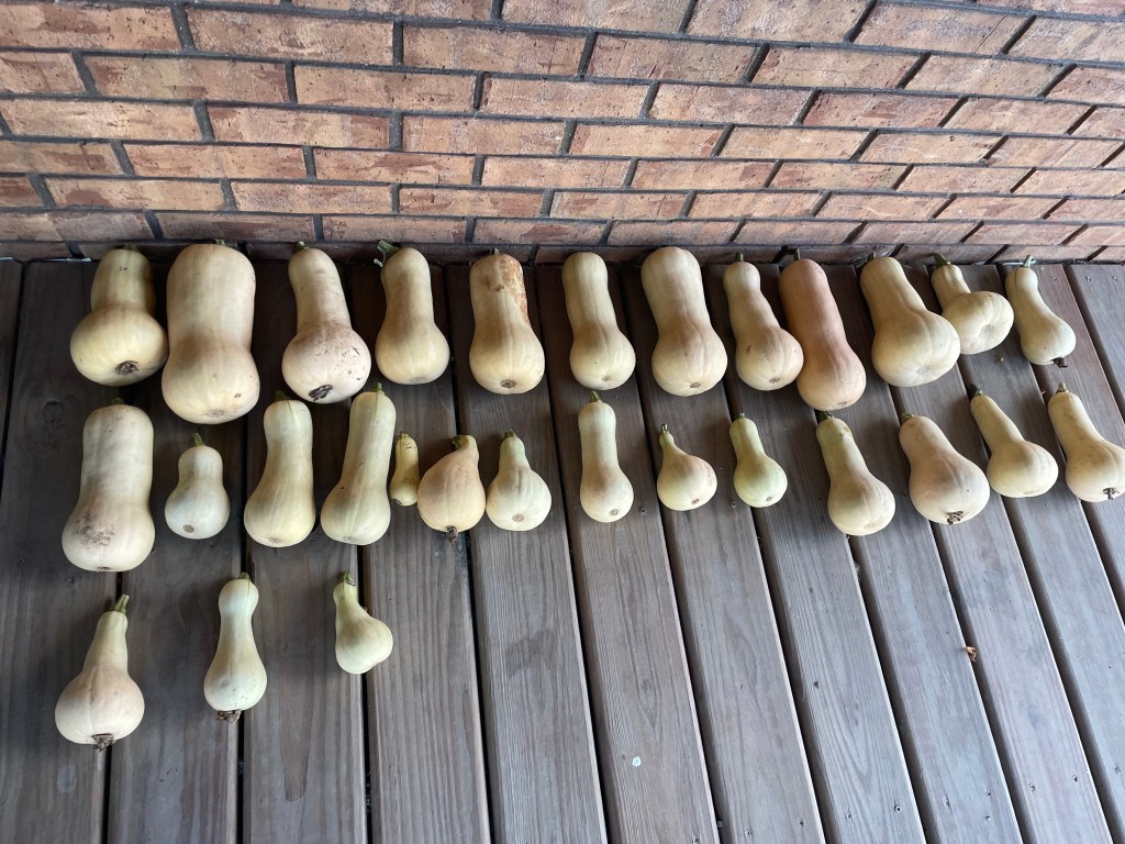 We didn’t get as many butternut squashes this summer as last. That’s ok, but I was sad the bugs came in and had a picnic. The other issue: I didn’t trim back the long vines so the plants could put energy into growing the fruits. These are curing on our deck for another week or so.