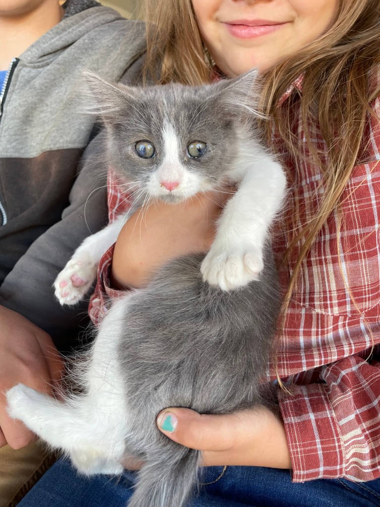 Meet Abel! He is 12 weeks old and has very soft, long gray and white hair. He is already very playful and we hope he will get along well with our 4 year old cat (Leroy) and our puppy, Meg. You may notice that his eye looks cloudy. He had an eye infection as a tiny kitten, was treated, and is completely healed. He has no trouble seeing- it just looks cloudy to us.