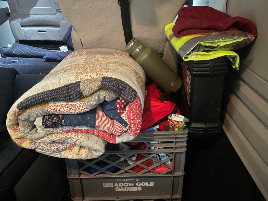 Any of these tips means you need to consider your family or spouse etc. What is your life stage? Think of everyone involved! Ages, needs, whether they are capable of thinking of these things for themselves. Don’t expect your toddler to always grab her coat as she gets into the van. Make sure your kids have the appropriate shoes, clothes, and gear they need as well as yourself. When my kids were younger, I would dress them in their snow pants if we were getting in and out of the van for errands. Warm, fit in the car seat, and they could throw their coats on as we hopped out.