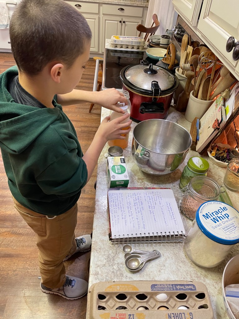 My second son, 11, wanted to make the bread dough this morning. I showed him the recipe and gave a few tips… have at it! We made rolls and 3 small braids to give away (top photo).