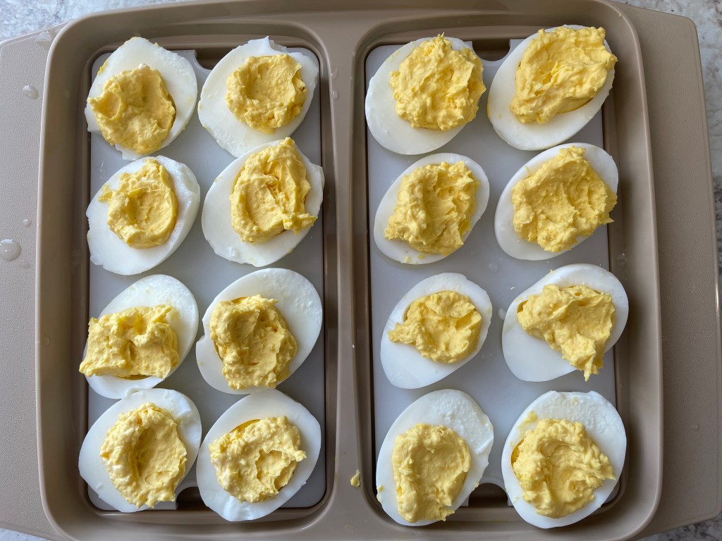 How do you make deviled (or dressed) eggs? Mine are as simple as avocado mayo and salt added to the mashed yolks. But, sometimes I also like to add a splash of pickle juice! These come in handy as a snack or an addition to the supper table.