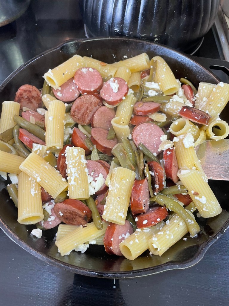 For a quick lunch, I sliced kielbasa, tossed in a jar of homegrown green beans, and boiled a few noodles I had in a random bag. Lastly, I topped with feta cheese for a nice and easy meal. I served this with raw kraut, deviled eggs, and fruit.