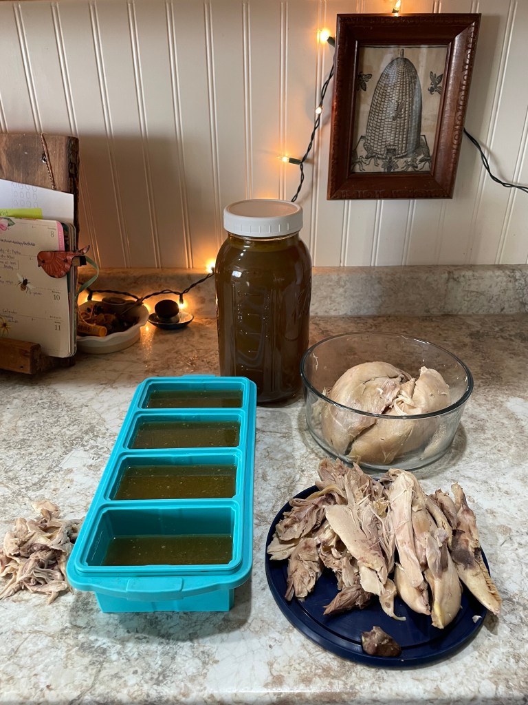 At the beginning of this post, I showed you how I was making meat stock and cooking a chicken- I do this once per week most weeks. In the end, this is what is left minus the bones and skin and veggie scraps. Several meals worth of chicken and lots of amazing stock! I use the half gallon jar throughout the next week and freeze the smaller cubes for uses in a pinch. When I make larger batches, I can some too for shelf stability.
