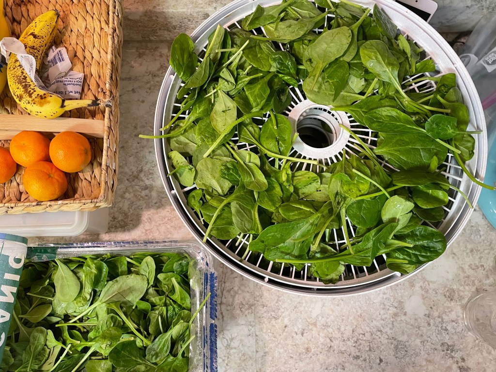 Here is that perspective photo I mentioned above. After drying two large boxes of organic spinach from Costco in my dehydrator on two separate days, I ended up with a little less than a pint of powder. Now I use it about 1 Tbsp at a time in lots of dishes, from burger patties to soups!