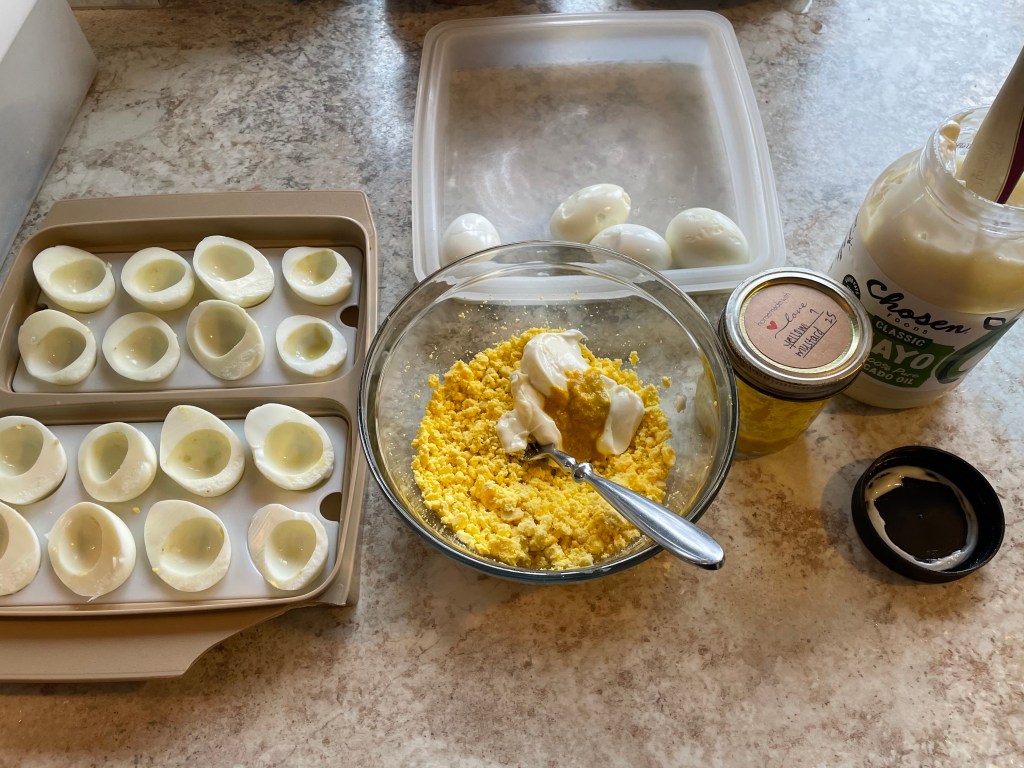I have also heard these referred to party eggs and my Granny calls them dressed eggs. Whatever you call them, they are a nice addition to any meal, make a yummy snack, and are my egg variety preference for breakfast. I don’t have a recipe because I steam different numbers of eggs (though it’s usually one dozen). My egg tray holds 8 whole eggs. Add mayo (I like this seed-oil free version), a touch of mustard (we love this homemade recipe), and salt/pepper to taste. That’s it! There are many different versions out there and I don’t always add mustard, but this is one way to make them!