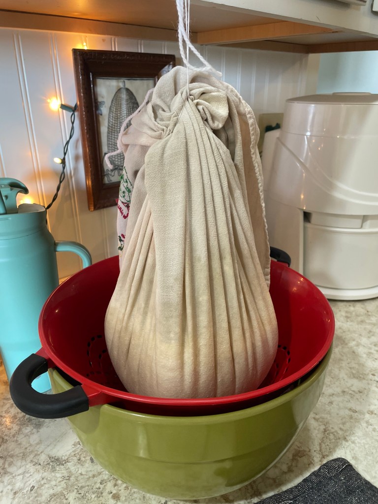 Following Ruthann Zimmermans’ recipe, I heated and strained the milk, making a lovely cottage cheese. This is the cheese I used in our lasagna the following week. I also threw some into a cheeseburger potato casserole and some pancakes.