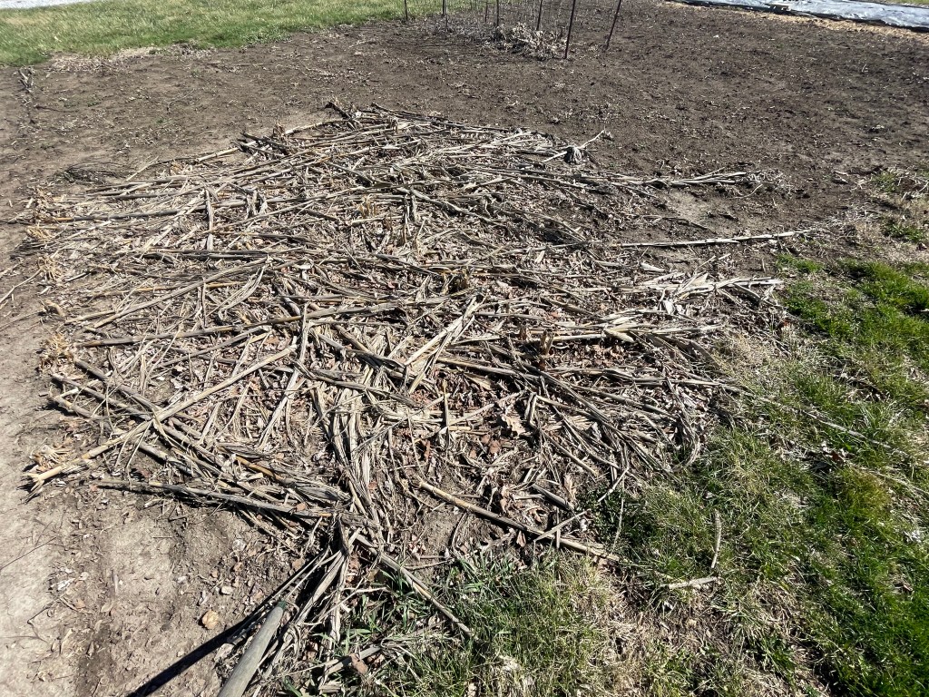 Finally, upon returning from our trip, there was yard and garden work to attend to. One item on the agenda was to clean up these corn stalks. Remember last fall, we cut them down and laid them in place so they would keep the ground covered. Upon moving them, several hundred beetles came out of them/the ground under them. I am assuming they are the beneficial variety. We took the stalks off of the garden and got it ready to amend and till.