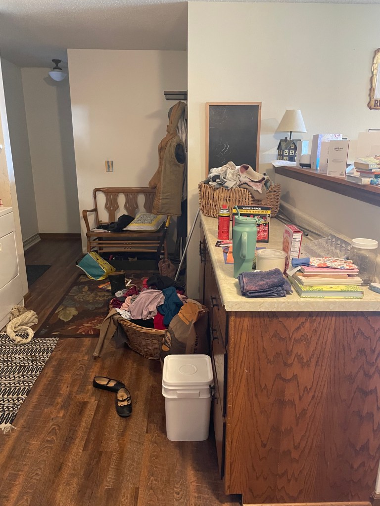 The entry way is our laundry room. We come into the house from the garage and the counter area catches ‘all’. Laundry gets folded here; seed packets stop here; wheat buckets pause before heading to our basement ‘grocery store’ area; and there is almost certainly a pile of books.