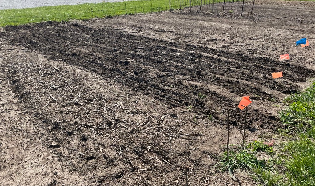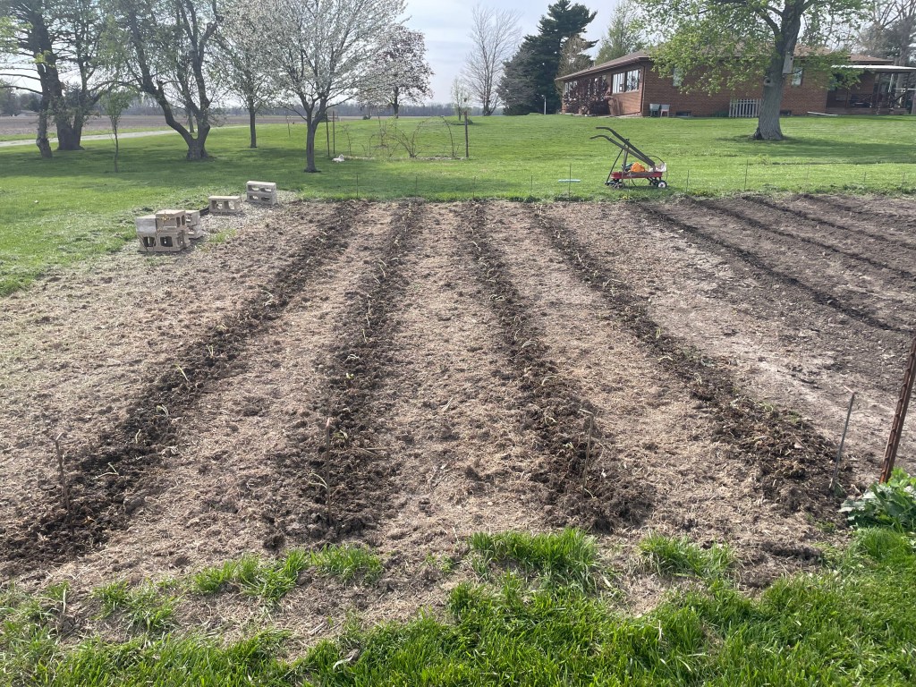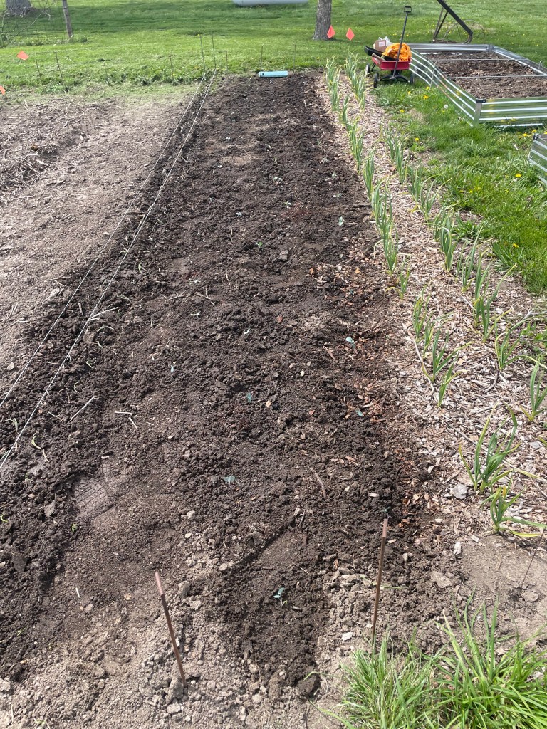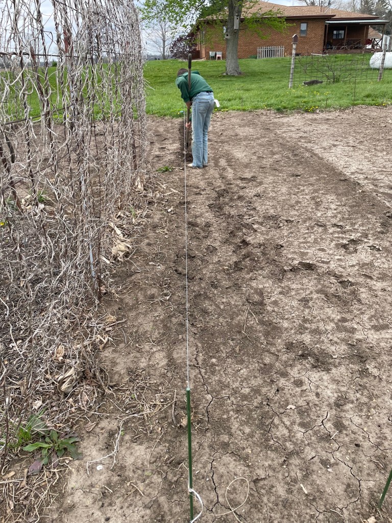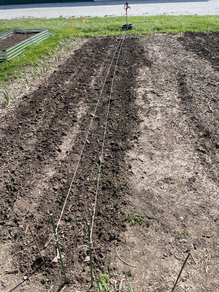 One thing we did this year that hasn’t been done completely in years past is to mark each row before anything is planted. Some seeds or plants are early- others are later. And they rarely line up in a straight line. So, by looking at my hand drawn garden plan, measuring and marking rows, we set ourselves up for success in getting early plants in and still having places for the remaining later crops.