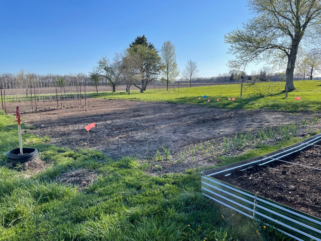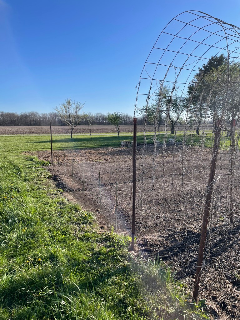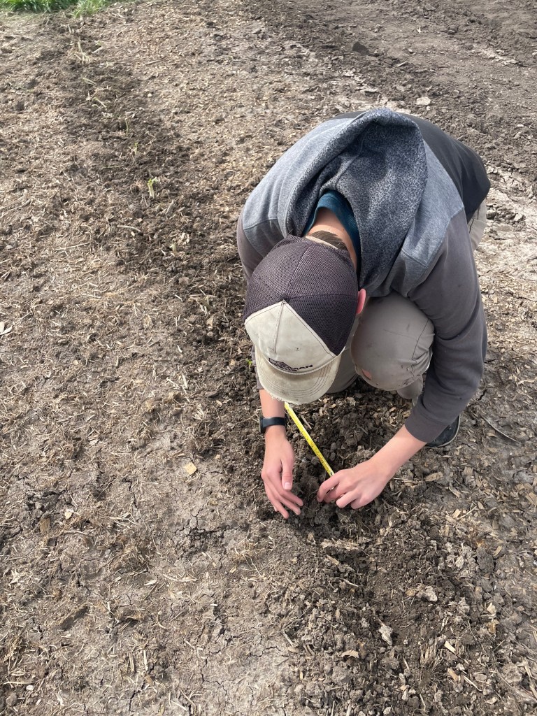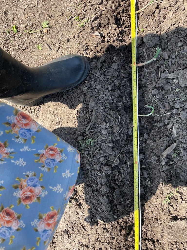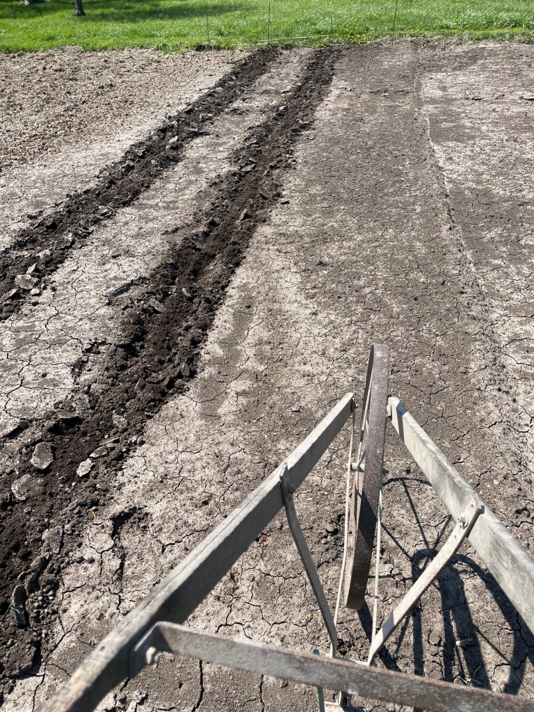 One thing we did this year that hasn’t been done completely in years past is to mark each row before anything is planted. Some seeds or plants are early- others are later. And they rarely line up in a straight line. So, by looking at my hand drawn garden plan, measuring and marking rows, we set ourselves up for success in getting early plants in and still having places for the remaining later crops.