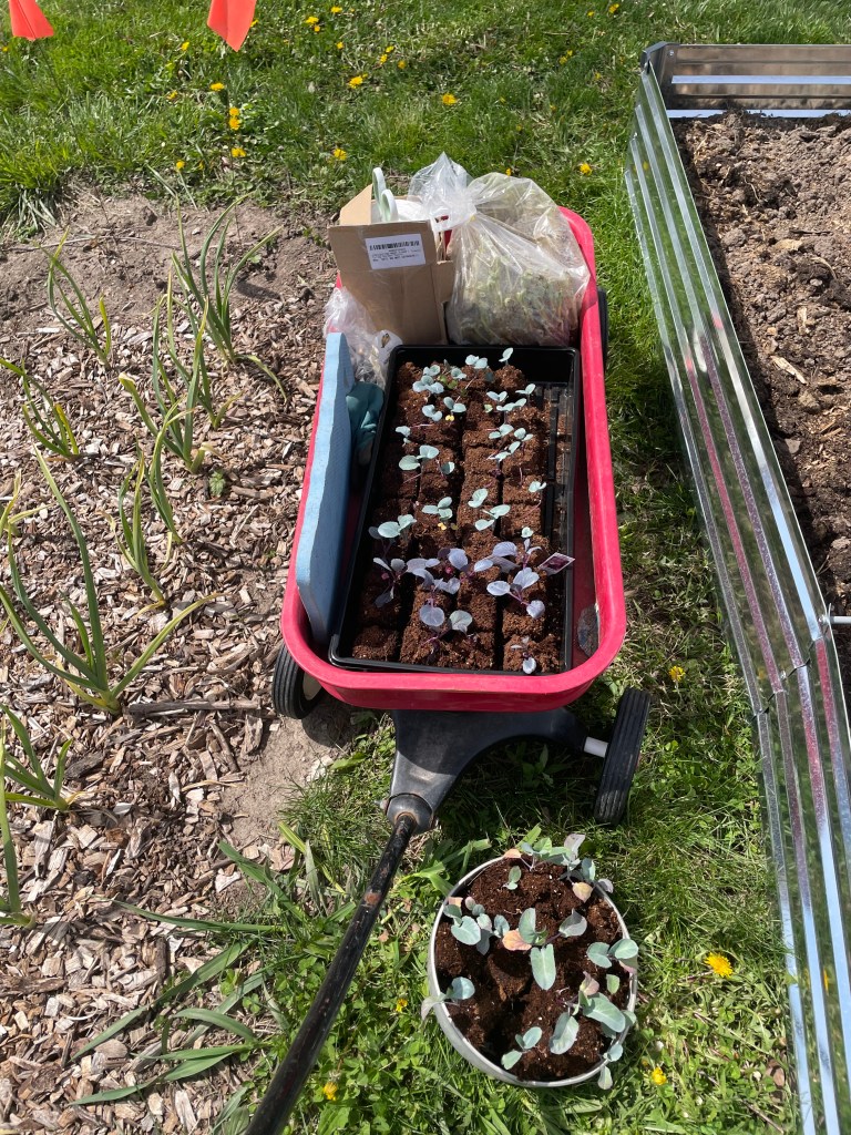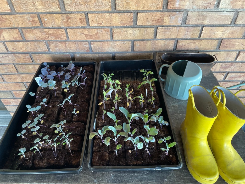 Hardening off seedlings is very important. and, though I don’t follow all of the rules completely, it is necessary to do some sort of acclimation for your seedlings (the ones you start, not the ones from a nursery) before they can be planted outside. Here are the brassicas as well as peppers and tomatoes (the latter went back downstairs to the basement set up).