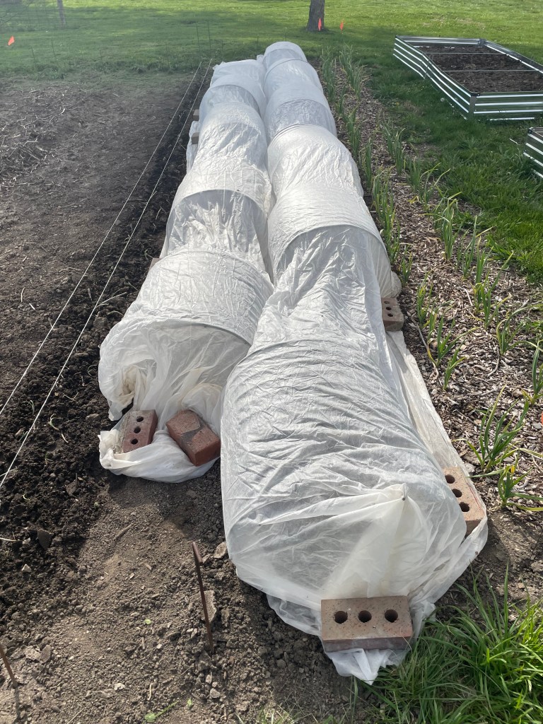 In years past when I did not cover my brassicas right away, rabbits came in and demolished them. So this year, as soon as I got the cauliflower(Cheddar), cabbage(Red Express), and broccoli(Imperial) planted, I covered the rows (with the help of my 14 year old). Stay away, rabbits!
