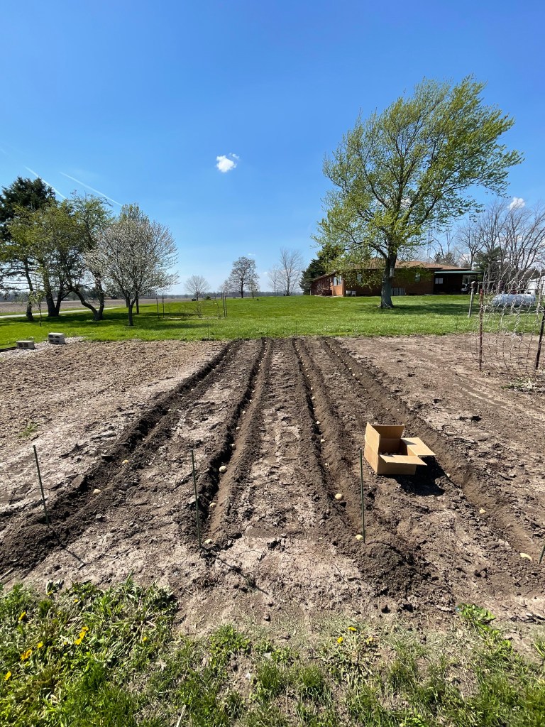 After the tilling Sweet Husband did for us this spring, these have to be the straightest potato rows I have ever hoed. Ha! We have 4 rows of Kennebek A potatoes (these are from Maine through Berlin Seed Co). I spaced these approximately18″ apart.