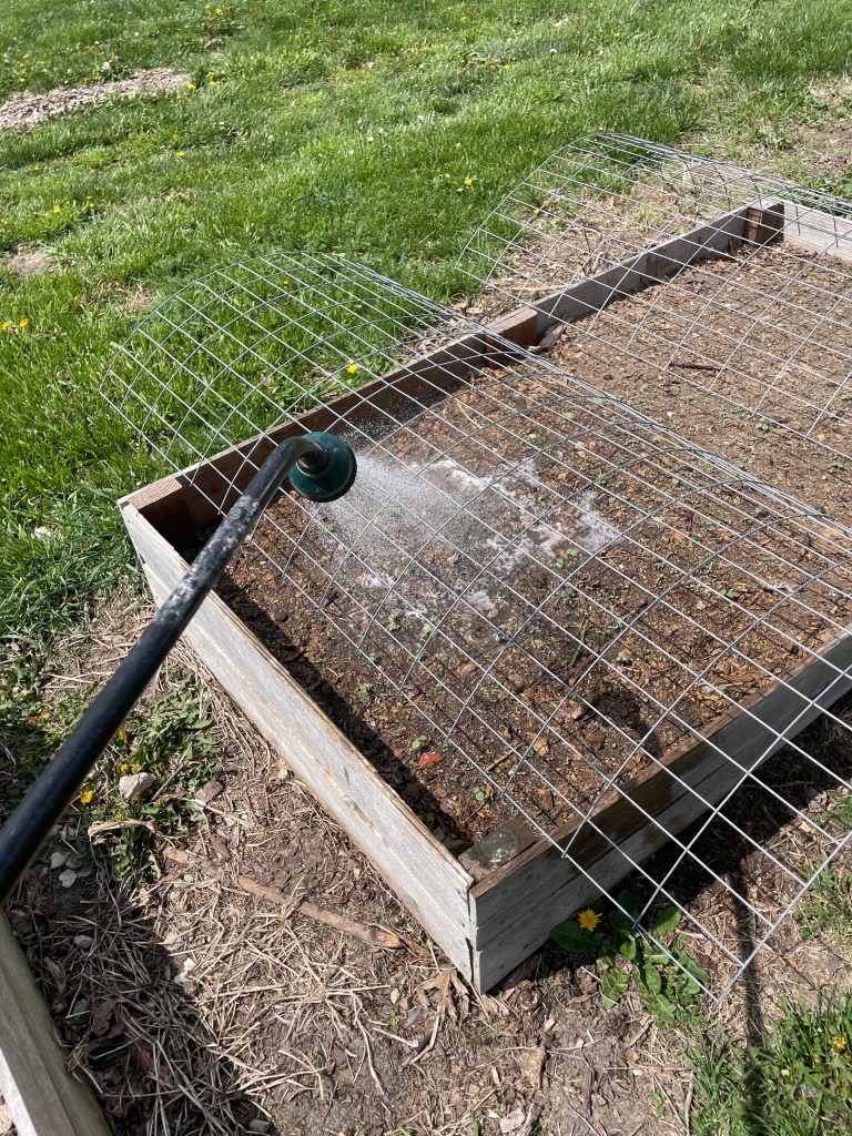 Lastly, this is the carrot/lettuce (carrot- Danvers Half Long/lettuce- Winter Density) bed I got planted several weeks ago. Carrots like to stay wet and sometimes do not germinate for several weeks. I was tickled that the rain was forecasted after I planted these and they sprouted fairly quickly, staying damp for days on end. Hoping for a good harvest. I plan to thin the carrots once they are bigger.
